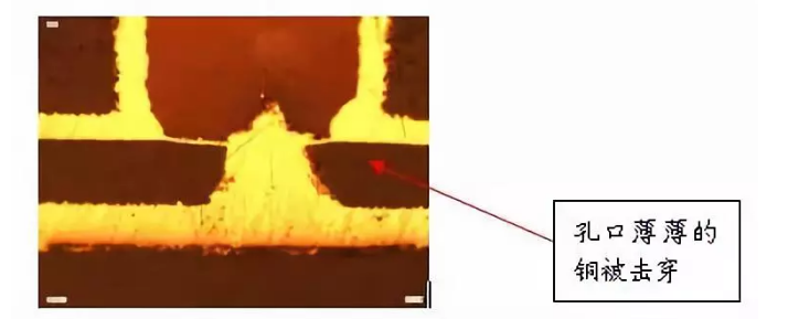 目前在行業(yè)通行的標(biāo)準(zhǔn)(IPC-650)里面,似乎還沒有給出對于樹脂塞孔的孔上面銅厚的要求,潛在的風(fēng)險是,一旦樹脂塞孔的孔上面電鍍的銅厚偏薄,經(jīng)過內(nèi)層HDI線路的表面處理,棕化處理以后,孔口上面的薄薄的銅會有被激光鉆孔鉆穿的可能,而且在電測試時是無法判定其有問題的。但這層薄薄的銅在耐高壓等方面的品質(zhì)著實讓人擔(dān)憂。